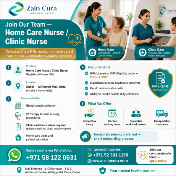 New Home Care Nurse / Clinic Nurse vacancy in Dubai, UAE for Registered Nurses. This opportunity is suitable for compassionate RNs interested in home care and clinic duties with immediate joining preferred.